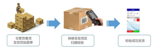 倉庫人員根據(jù)銷售人員的出貨計劃,安排銷售發(fā)貨。倉庫人員使用手持終端設(shè)備掃描源單發(fā)貨通知單,并逐一掃描成品條碼,確認(rèn)出貨數(shù)據(jù)無誤后,系統(tǒng)生成銷售出庫單。